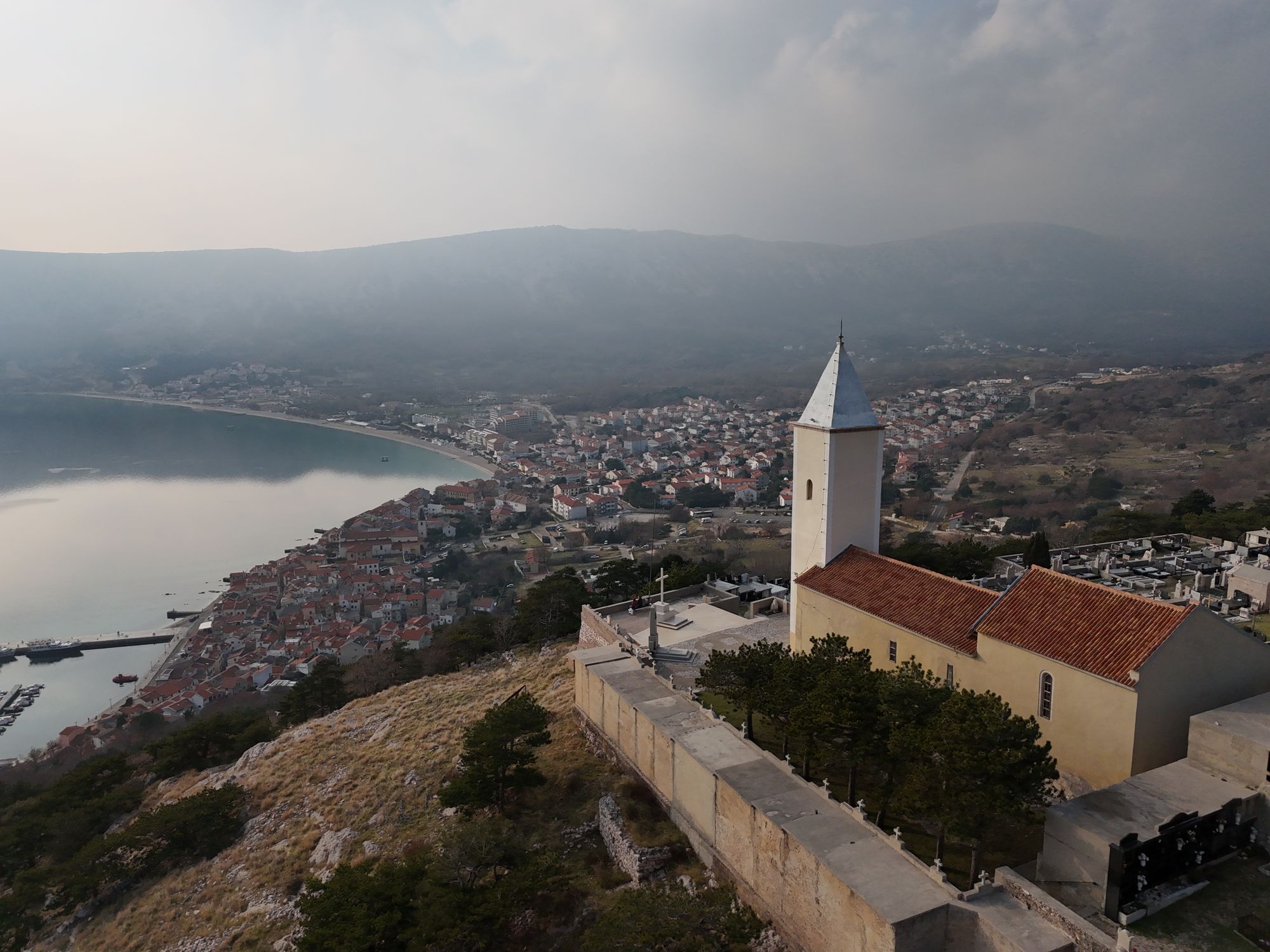 Nedjeljno jutro vodilo nas je prema Baškoj i crkvi Sv. Ivana, s koje se pruža prekrasan pogled na Bašćansku uvalu. Od crkve smo laganom stazom kroz borovu šumu, uživajući u stalnom pogledu na Bašku, krenuli prema poznatom platou Mjeseca. Na ovom specifičnom krškom području, nalik na površinu Mjeseca, popeli smo se na vrh Hlam. Suhozidi u obliku krugova podsjećali su na mjesečeve kratere, a pogled prema Velebitu i otoku Prviću bio je očaravajući. Od jutra smo pomno pratili razne  vremenske prognoze prema kojima je bilo 50% šanse da će padati kiša, a 100% da neće, većim dijelom staze pratilo nas je sunce koje bi da nije jakog juga baš lijepo grijalo. Uglavnom, kišu smo u potpunosti izbjegli.