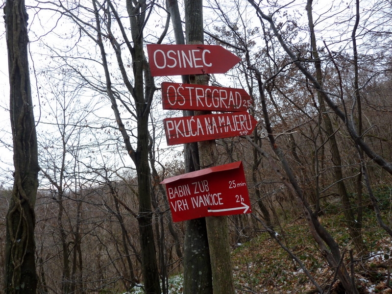 Planinarska kuća pod Belecgradom-Belige-Babin zub-Ivanščica (vrh, 1060 m/nm) – KT HPO-a, cca 2 – 2,30 h (odmor kod pl.doma) – Oštrcgrad (KT HPO-a) – Planinarska kuća na Majer, cca 2,30-3,00 h (noćenje).