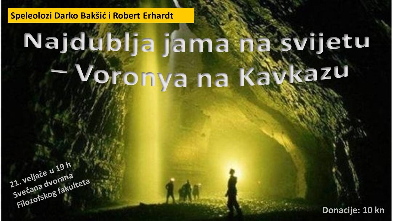 Osim prikazivanja ciljeva i tijeka same ekspedicije, na kojoj su se hrvatski speleolozi po prvi puta spustili ispod čarobne dubine od -2000m,  što je trenutno hrvatski dubinski rekord, kroz prezentaciju  ćemo se upoznati sa morfologijom Voronye, a i  geologijom i hidrologijom masiva Arabika gdje se Voronya nalazi.