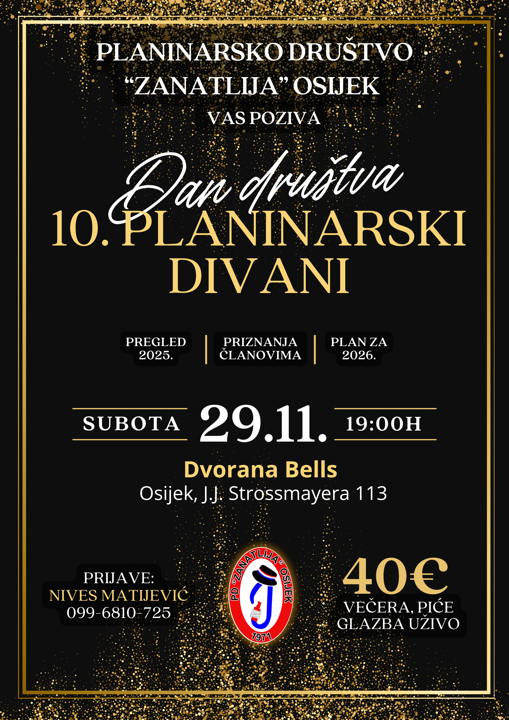 02/10/2025Planinarsko društvo “Zanatlija” Osijek ove godine svečano obilježava 10. jubilarni Dan društva – Planinarske divane. Datum: 29. studenoga 2025.Mjesto: svečana sala Bells, J. J. Strossmayera 113, OsijekVrijeme: početak u 19:00 sati Za ovu posebnu obljetnicu pripremili smo program dostojan jubileja.…