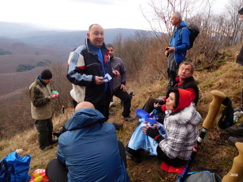 Nakon fotografiranja i pozdravnog govora današnjeg vodiča Željka Petrovića, koji je obuhvaćao upute i opis današnje staze, krenuli smo uz potok ponornicu Radovanku prema Orahovim vodama. Ostali vodiči na izletu bili su Jela Knežević, Kristijan Horvat i Stjepan Schönberger. Put je vodio čvrstom makadamskom cestom uz stjenjak Sokoline i pored Babine pećine sve do okretišta gdje smo se kroz šumu laganim usponom popeli do Orahovih voda. Nakon kraće pauze, grupa od šest planinara odlučila je vratiti se prema Velikoj preko Mališćaka i Turjaka, a ostali su se zaputili planiranom rutom preko Vratnica i ulaza Zvečevačkog do vrha Papuka. Ondje smo stigli u 12.40 sati. Nakon polusatne pauze na vrhu za odmor, uživanje u pogledu, užinu i fotografiranje, te ispijanje tradicionalnog šampanjca, krenuli smo natrag istim putem. Uz nekoliko kraćih pauza i bez većih zastoja i teškoća do početne točke na Poljanicama, gdje nas je čekao autobus, stigli smo u 16.00 sati.