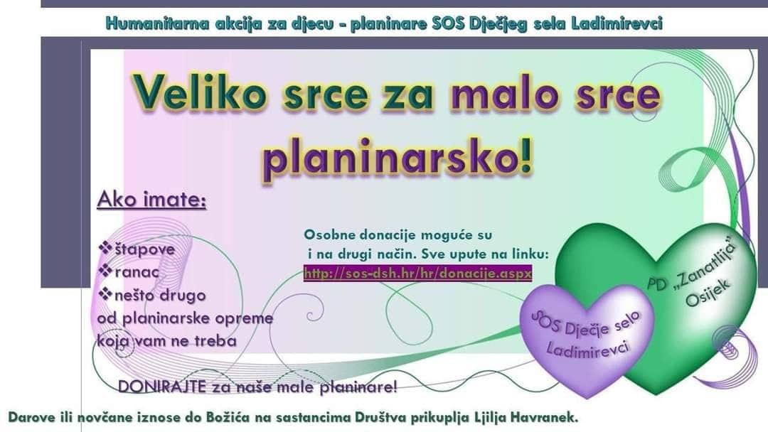 I ove godine imamo akciju darivanja naših malih planinara iz SOS sela Ladimirevci. Prikupljamo planinarske stvari i novčane donacije, da bismo našim dragim prijateljima omogućili lakše planinarenje.