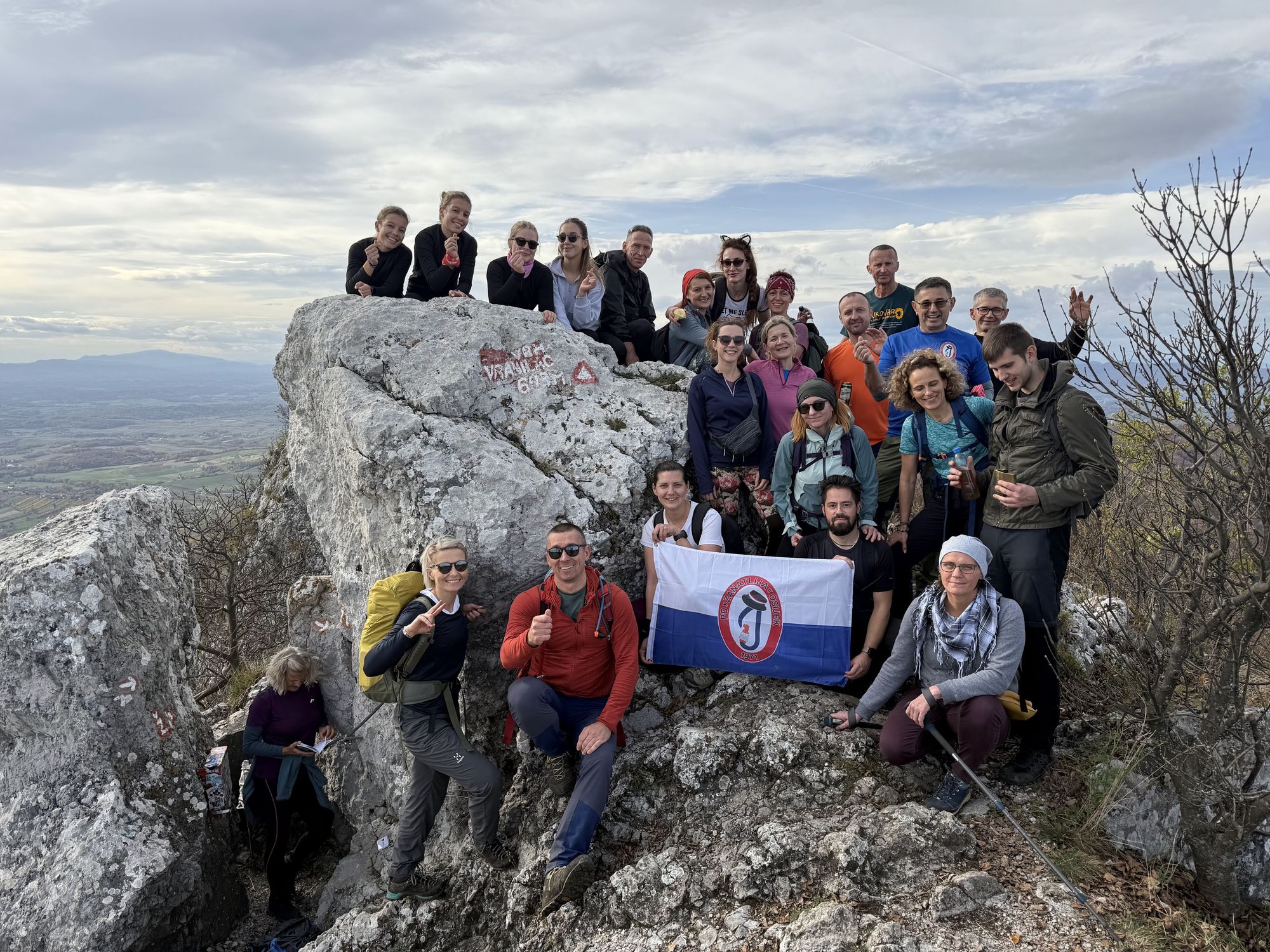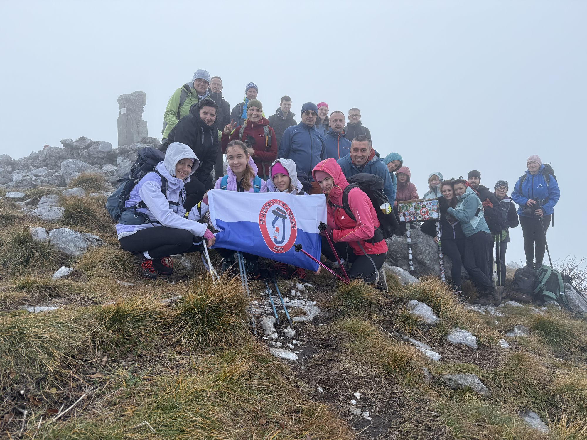 Atmosfera je bila vesela, ispunjena smijehom, fotografiranjem i međusobnim bodrenjem (poneko bodrenje u obliku prijetnje ). Na vrhu smo se ponovno svi okupili – oni koji su išli poučnom stazom i mi koji smo se penjali po „zubima“. Napravili smo pauzu za okrjepu, snimili još koji zajednički selfie i zajedno se spustili prema planinarskom domu.