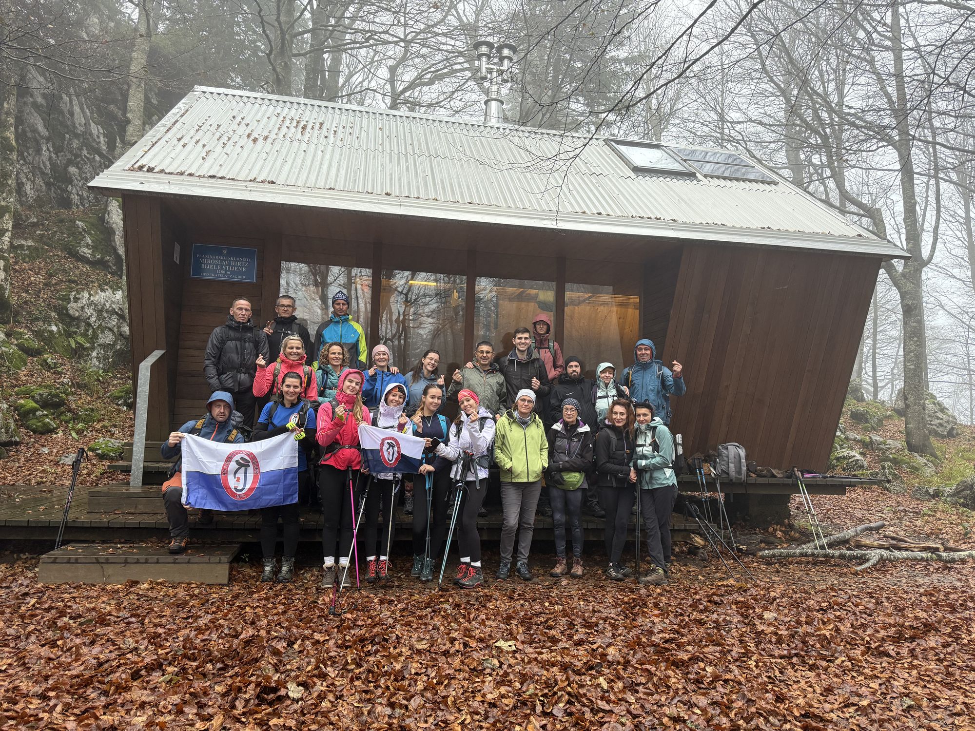 Bilo je već prilično kasno kad smo se dovezli do drugog uspona koji je vodio ka Bijelim Stijenama, ali uspon je bio prekrasan. Gušt hoda kroz takvu šumu kad čovjek stane i okrene se oko sebe dovoljan je da se kompletno resetiraš. S obzirom na duljinu dana, naše finalno odredište bilo je planinarsko sklonište Miroslav Hirtz, Bijele stijene (1280m). Tamo smo prvi put opalili zajedničku sliku s motivom korejskog srca. To je pojam s kojim su nas upoznale naše najmlađe planinarke, pripadnice generacije Z. Za sve milenijalce i starije, ovako kaže ChatGPT: „Korejsko srce“ (u doslovnom prijevodu s korejskog „srce od ruke“) je popularna gesta rukom koja potječe iz Južne Koreje i koristi se za izražavanje ljubavi, naklonosti ili zahvalnosti. Izvedba je jednostavna: Spoje se palac i kažiprst tako da njihov vrh tvori mali oblik srca, dok ostali prsti ostaju savijeni. Gesta izgleda kao da se „štipa zrak“, ali simbolizira malo srce. Dakle — kad netko napravi „korejsko srce“, to je slatki način da kaže „volim te“, „hvala“ ili „cijenim te“. U zadnju sekundu danjeg svjetla spustili smo se nazad u podnožje, tako da većini naglavne lampe ipak nisu trebale.