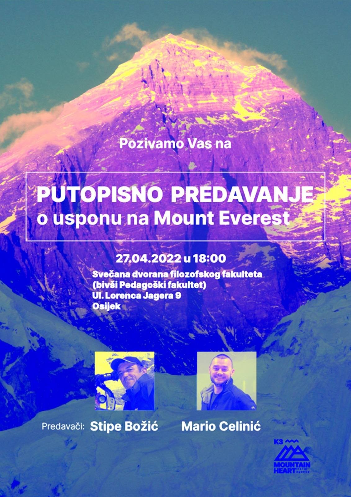 Pozivamo vas da dođete 27.4.2022.g. u 18 sati na Filozofski fakultet i poslušate predavanje o zanimljivom pothvatu uspona na Mount Everest naših renomiranih planinara i alpinista Stipe Božića i Maria Celinića.