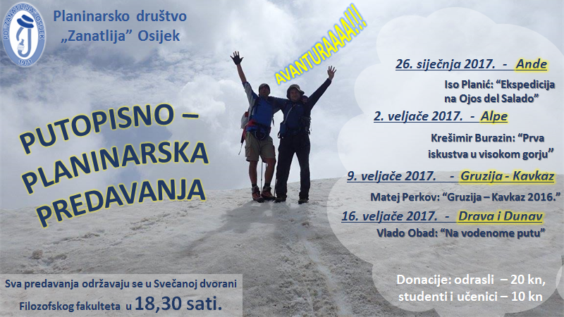 Tradicionalno, kao i svake godine u ovo vrijeme započinju zanimljiva predavanja o planinarenju, zanimljivim destinacijama, doživljajima,... Jedno od predavanja, ne i prvo, je ono Mateja Perkova. Sva predavanja će se održati četvrtkom u svečanoj dvorani Filozofskog fakulteta, s početkom u 18.30 sati.…