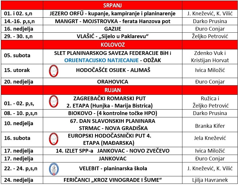 Objavljujemo plan izleta za naredna tri mjeseca. Izleti koji dolaze Promjene u rasporedu izleta: Izlet za Orfü je odgođen. Legenda: S.S. - seniorska sekcija V.S. - visokogorska sekcija S.J.R. - sekcija Sveti Josip Radnik D. - Dumine KONTAKT MOBITELI VODIČA: …